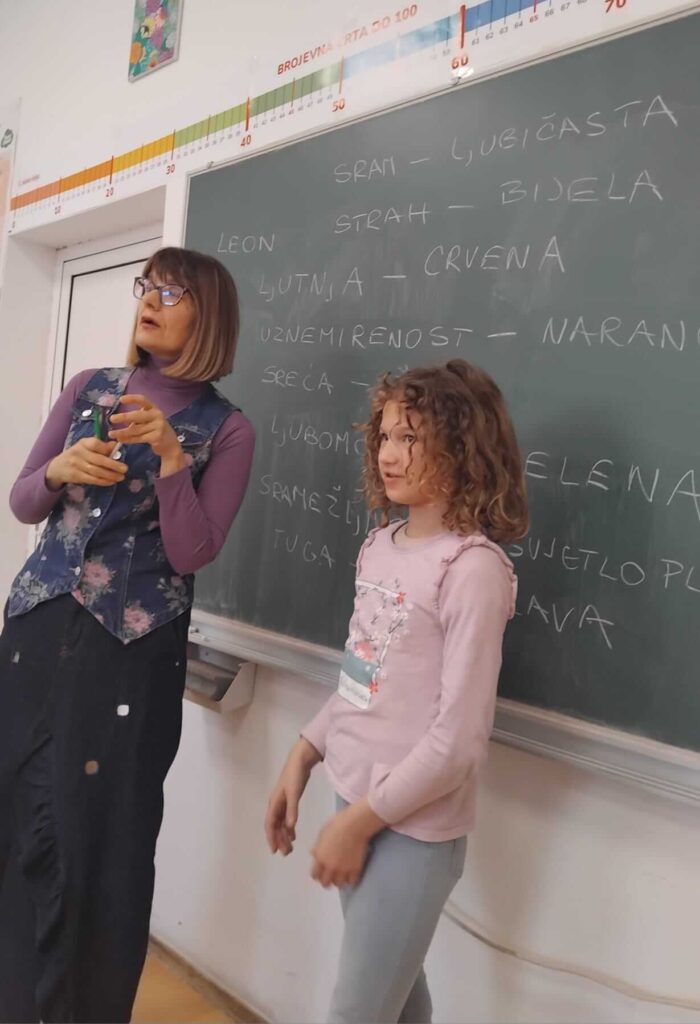 Učenici su izvlačili bojice, imenovali osjećaje i pričali o situacijama u kojima se pojedini osjećaj javlja. Na kraju su po izboru svoj papir obojali bojom koja pokazuje njihovo trenutno raspoloženje.