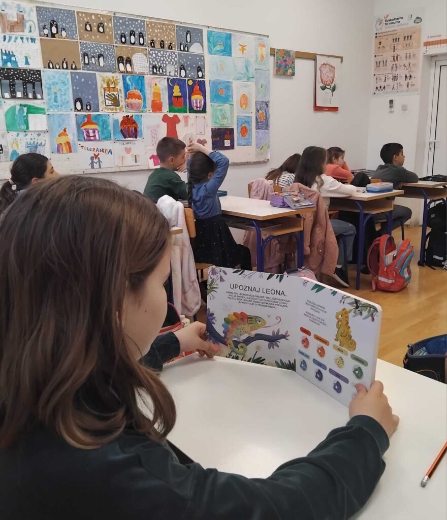 U Tjednu psihologije u našoj školi održana je ( 12.3.2026.) radionica u drugom razredu. Pročitali smo slikovnicu “Snažni osjećaji” i upoznali se sa kameleonom Leonom. Leon mijenja boje zavisno kako se osjeća.