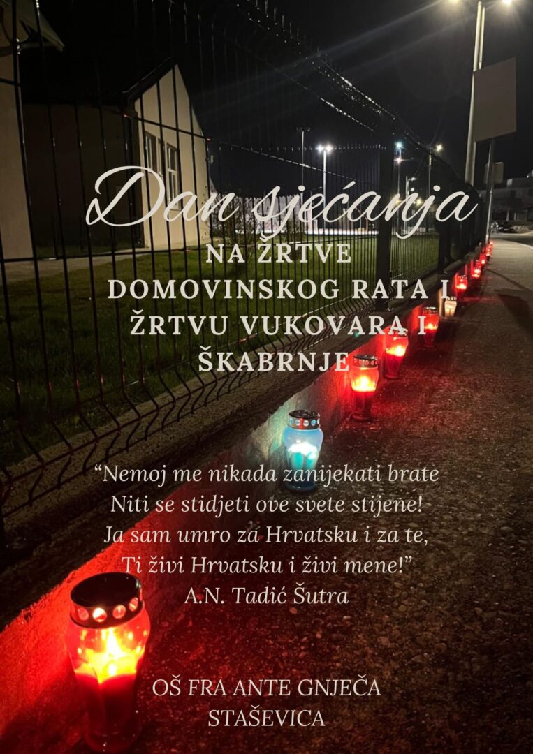 U našoj školi 17. studenoga, u večernjim satima, obilježen je Dan sjećanja na žrtve Domovinskog rata i Dan sjećanja na žrtvu Vukovara i Škabrnje. U mirnoj i dostojanstvenoj atmosferi učitelji, učenici, roditelji i mještani zajednički su zapalili svijeće od škole do obale Matice. Prisjetili smo se svih stradalih, svih onih koji su svojim životima branili našu domovinu i omogućili nam slobodu koju danas živimo. Time smo simbolično odali počast svim žrtvama te pokazali jedinstvo u očuvanju sjećanja.