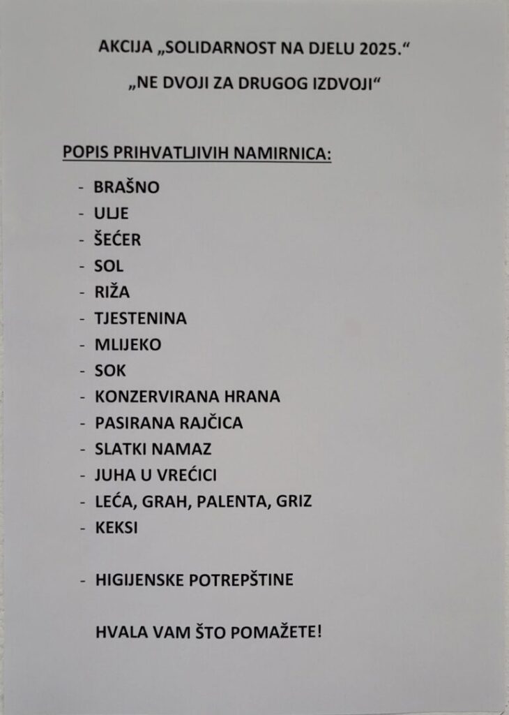 Popis namirnica koje učenici mogu donirati: BRAŠNO, ULJE, ŠEĆER, SOL, RIŽA, TJESTENINA, MLIJEKO, KONZERVIRANA HRANA, SLATKI NAMAZ, JUHA U VREĆICI, LEĆA, GRAH, KEKSI I HIGIJENSKE POTREPŠTINE.